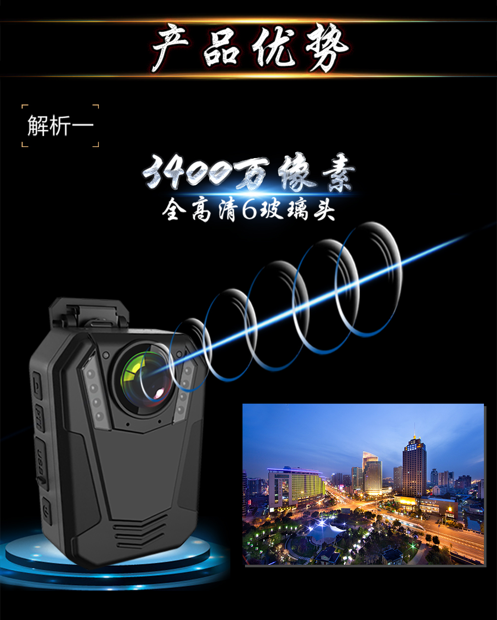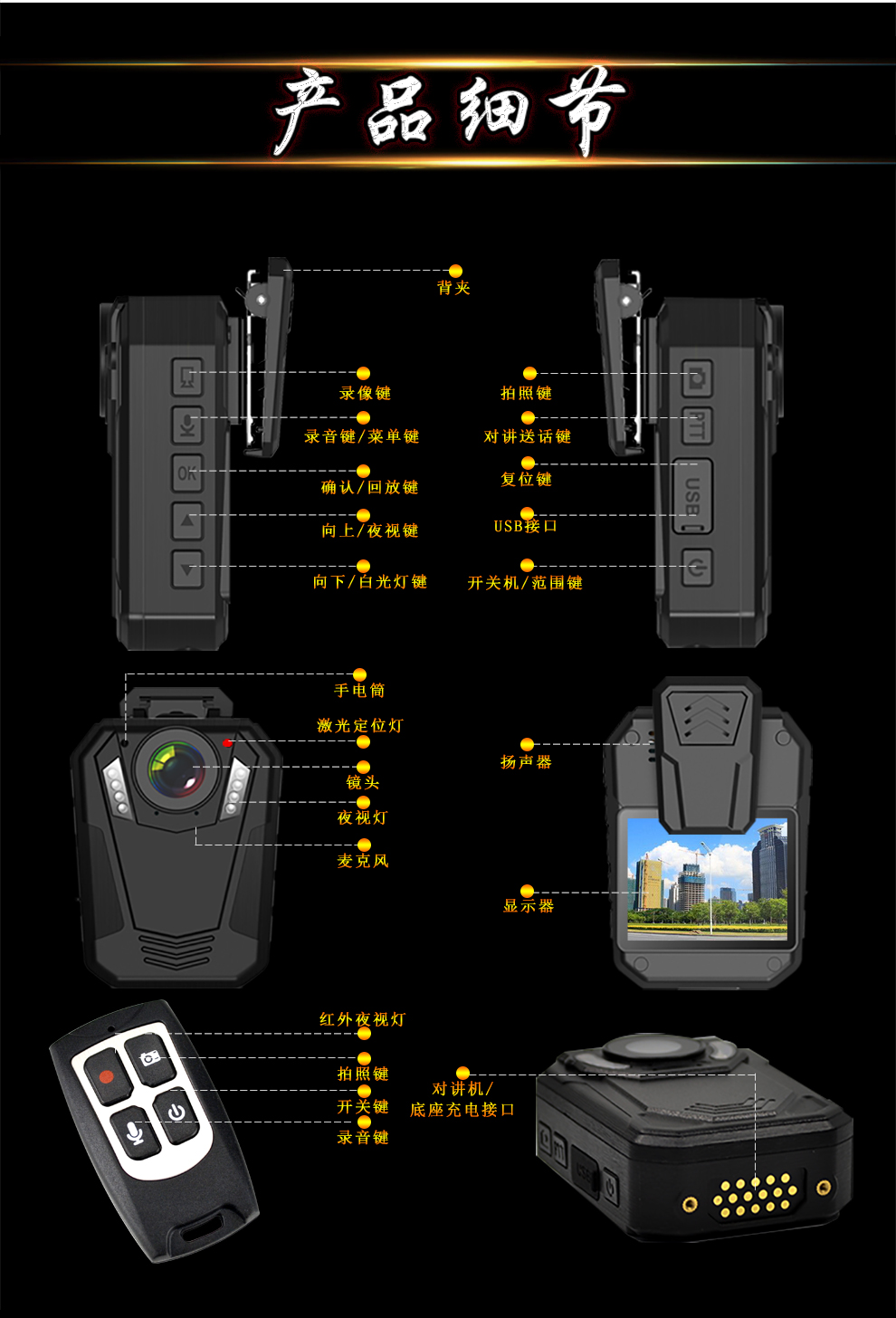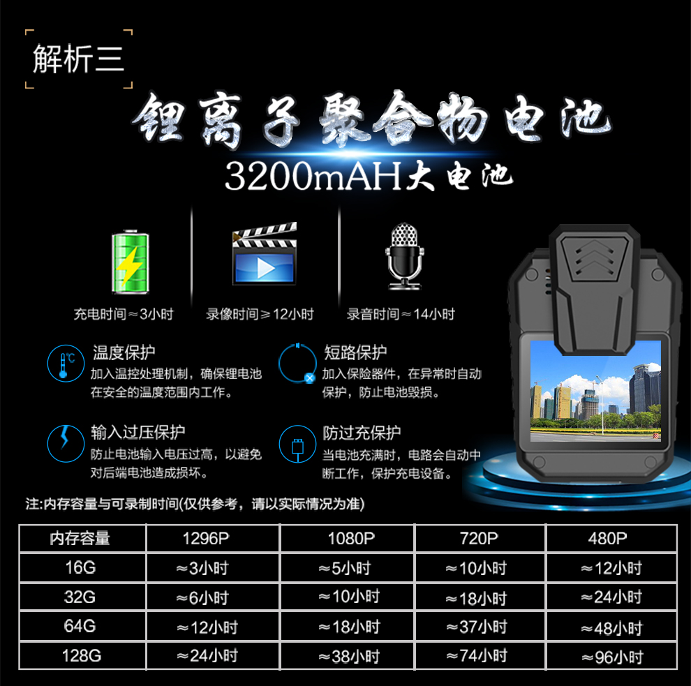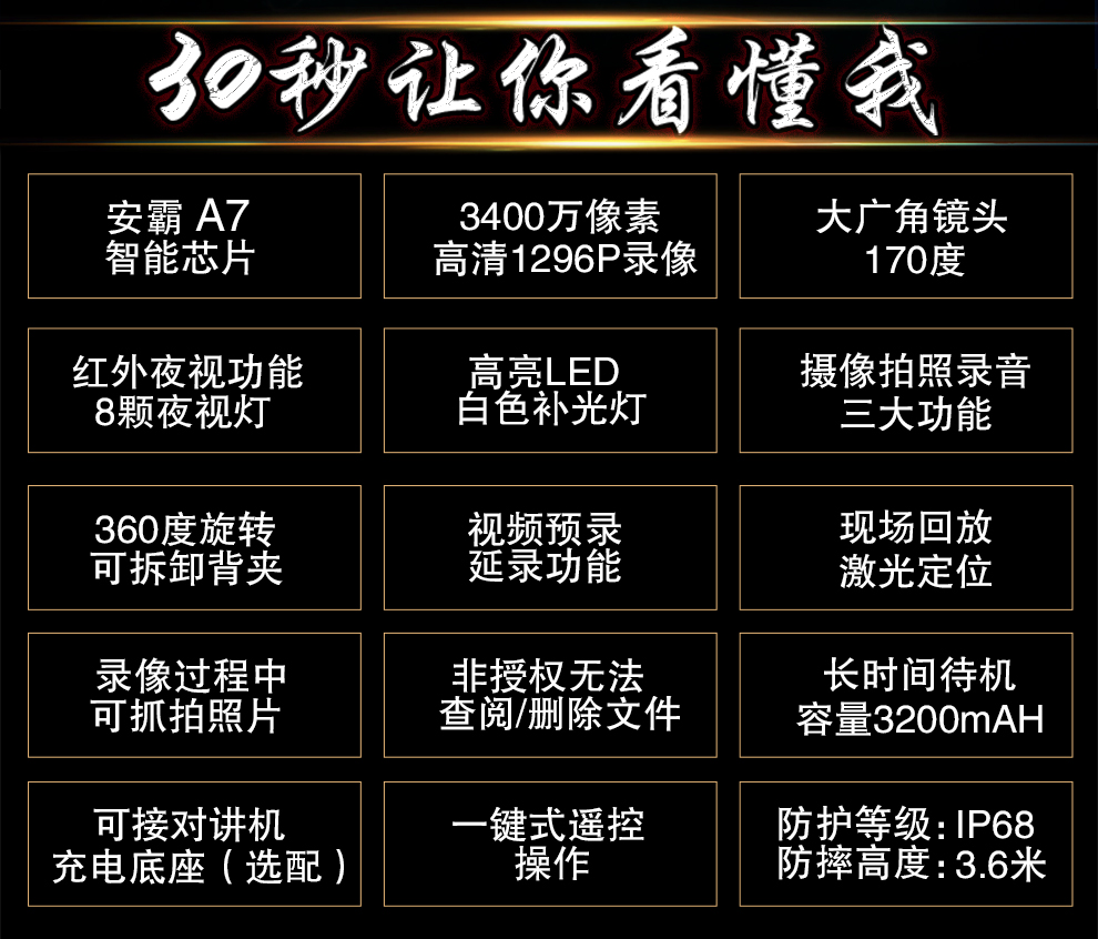 產(chǎn)品功能:紅外夜視;循環(huán)錄影;外接攝像頭;防水;防摔;防塵